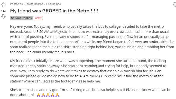 Expressing her anger in direction of the incident, she reached out to Redditors for assist for her pal. “She’s traumatised and my god. I’m so fu***** mad, but also helpless :’( !! Plz let me know what can be done about this,” she concluded.