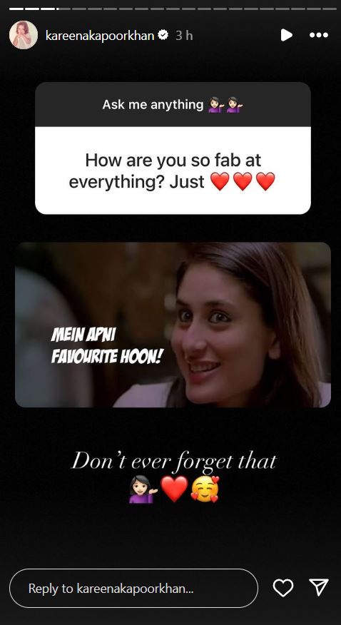 Recently, Kareena Kapoor indulged in a sequence of AMA-format Instagram Stories. When a fan requested her “How are you so fab at everything?” The a number of Filmfare-winning actor shared a nonetheless from Jab We Met wherein her character Geet says, “Mai Apni Favourite Hu”. While sharing this nonetheless, Kareena sassily provides, “Don’t ever forget that.”