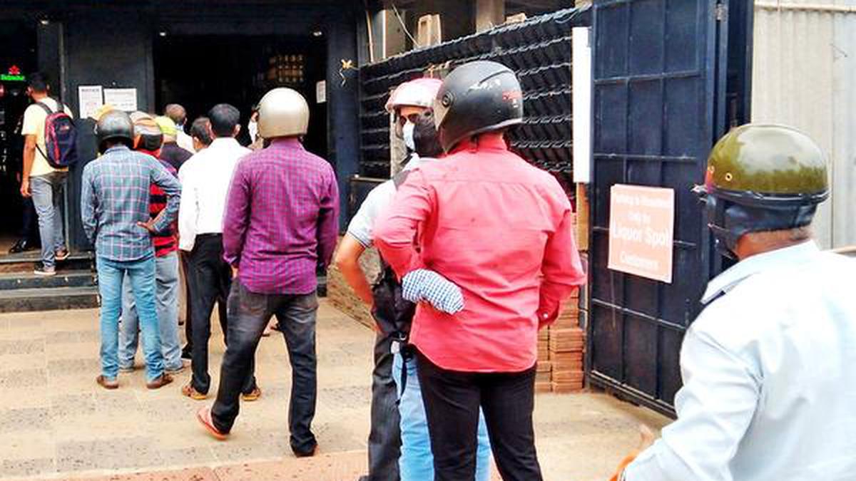 A file photograph of prospects queuing up outdoors a liquor store in Belagavi, Karnataka.